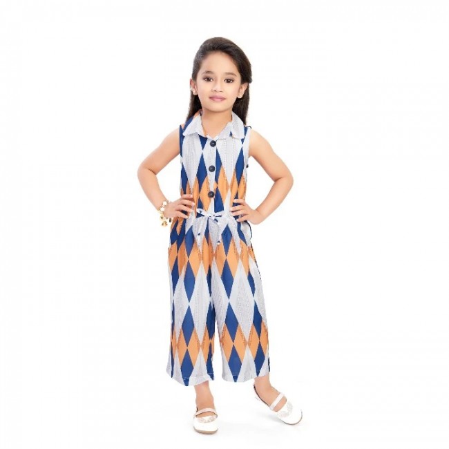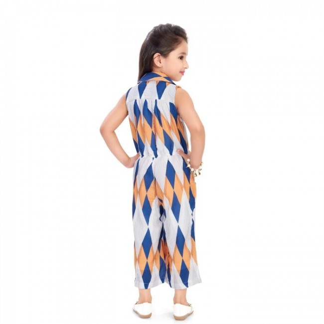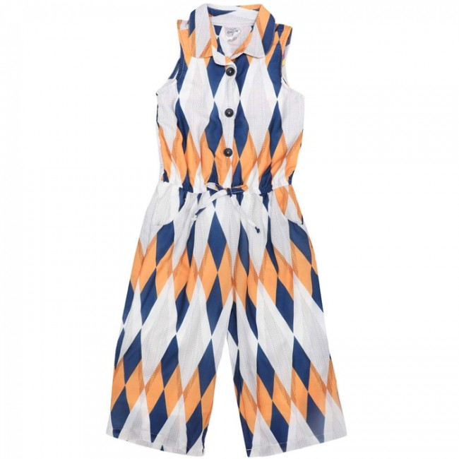 Mustard Colour abstract printed jumpsuit, has a shirt collar, Sleeveless, and a waist tie-up. A comfortable dress and a must have style for every girl!